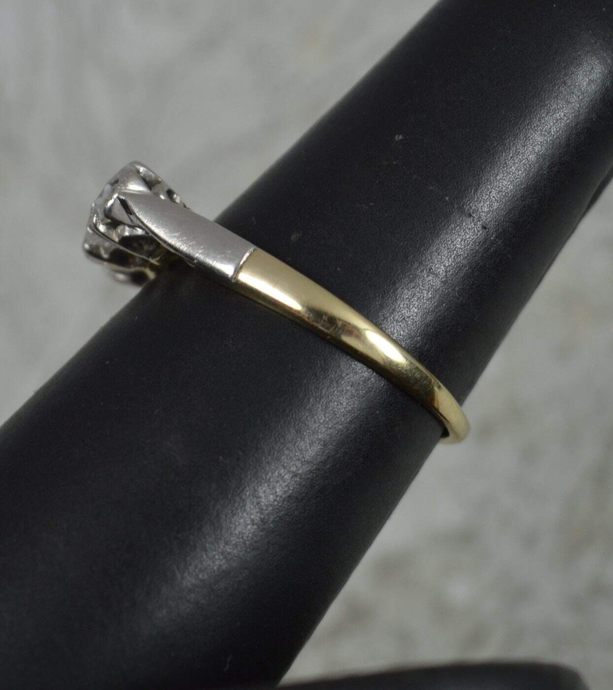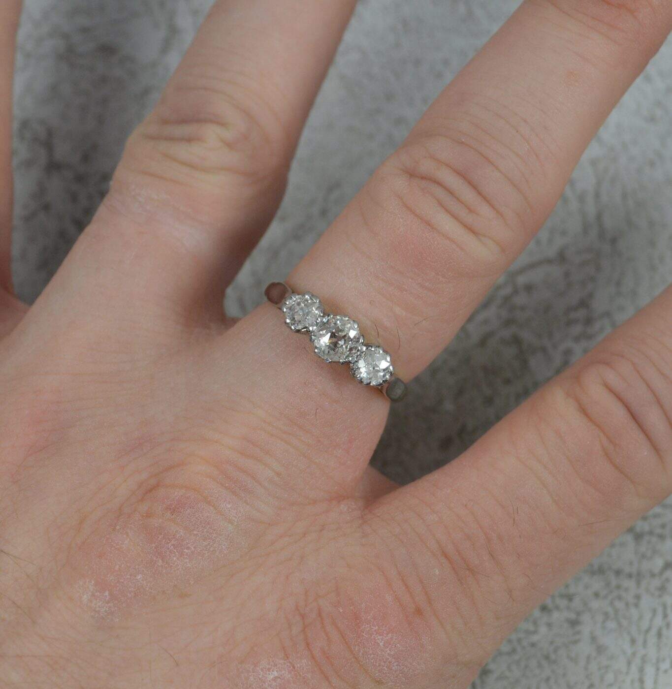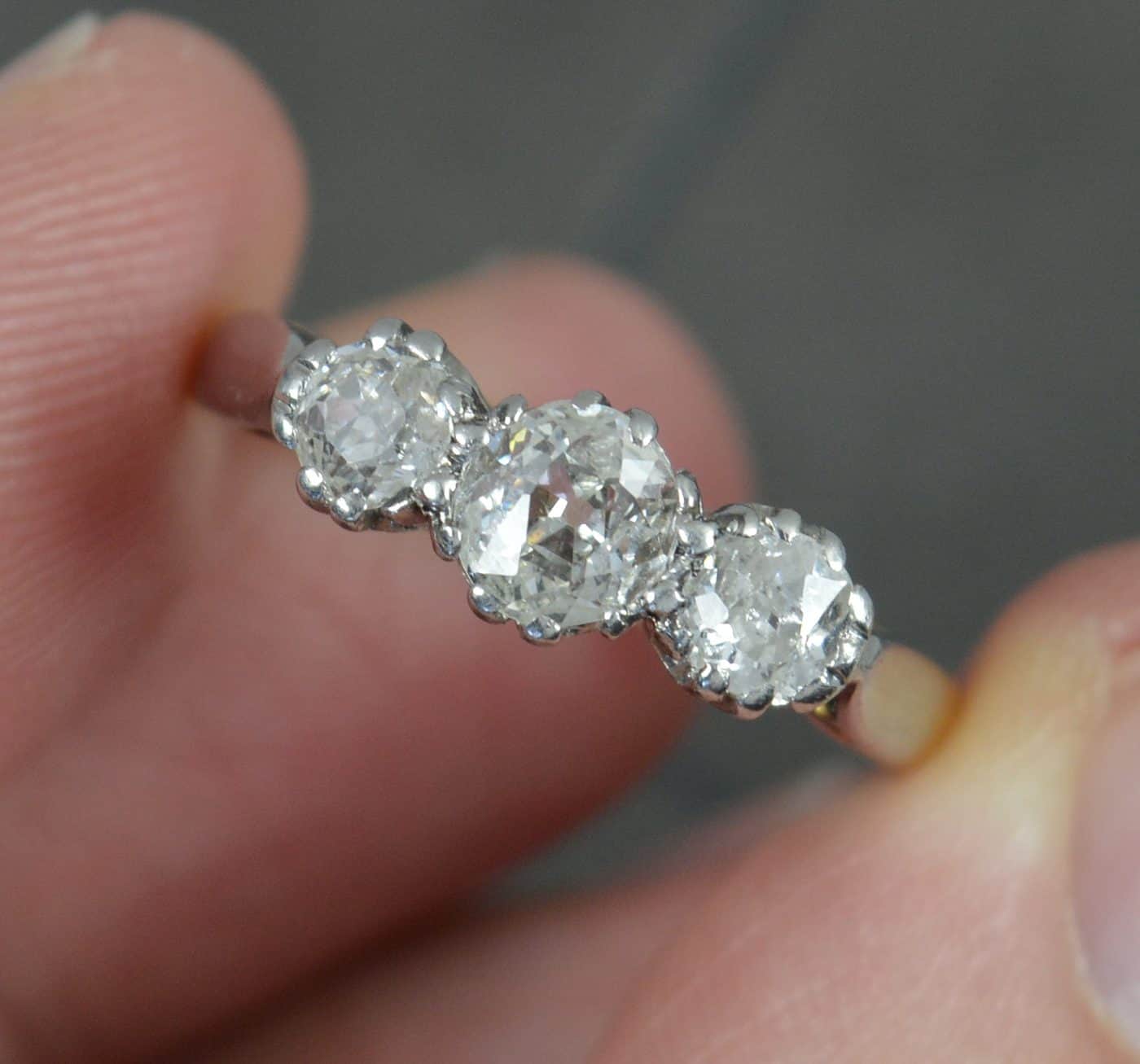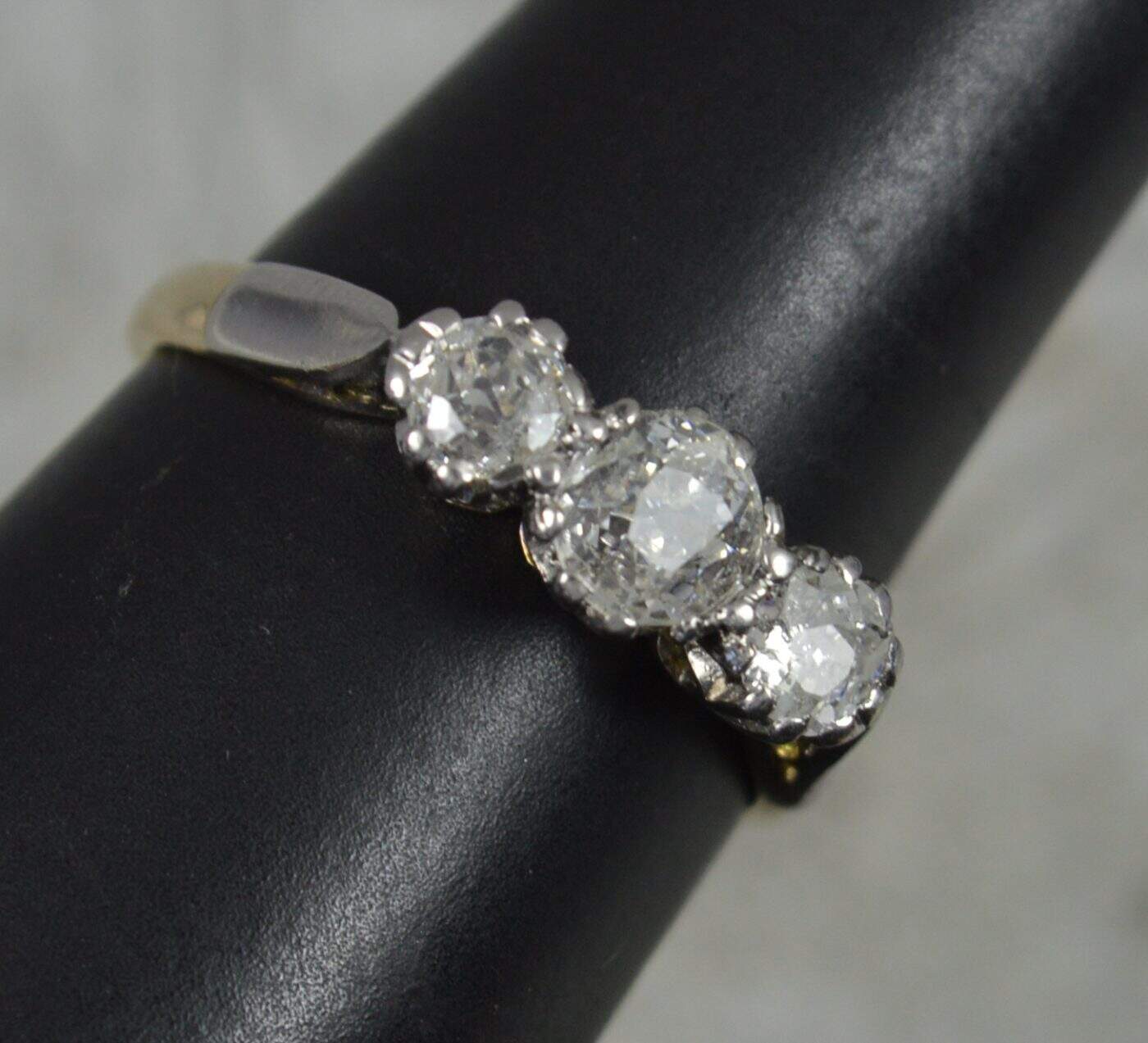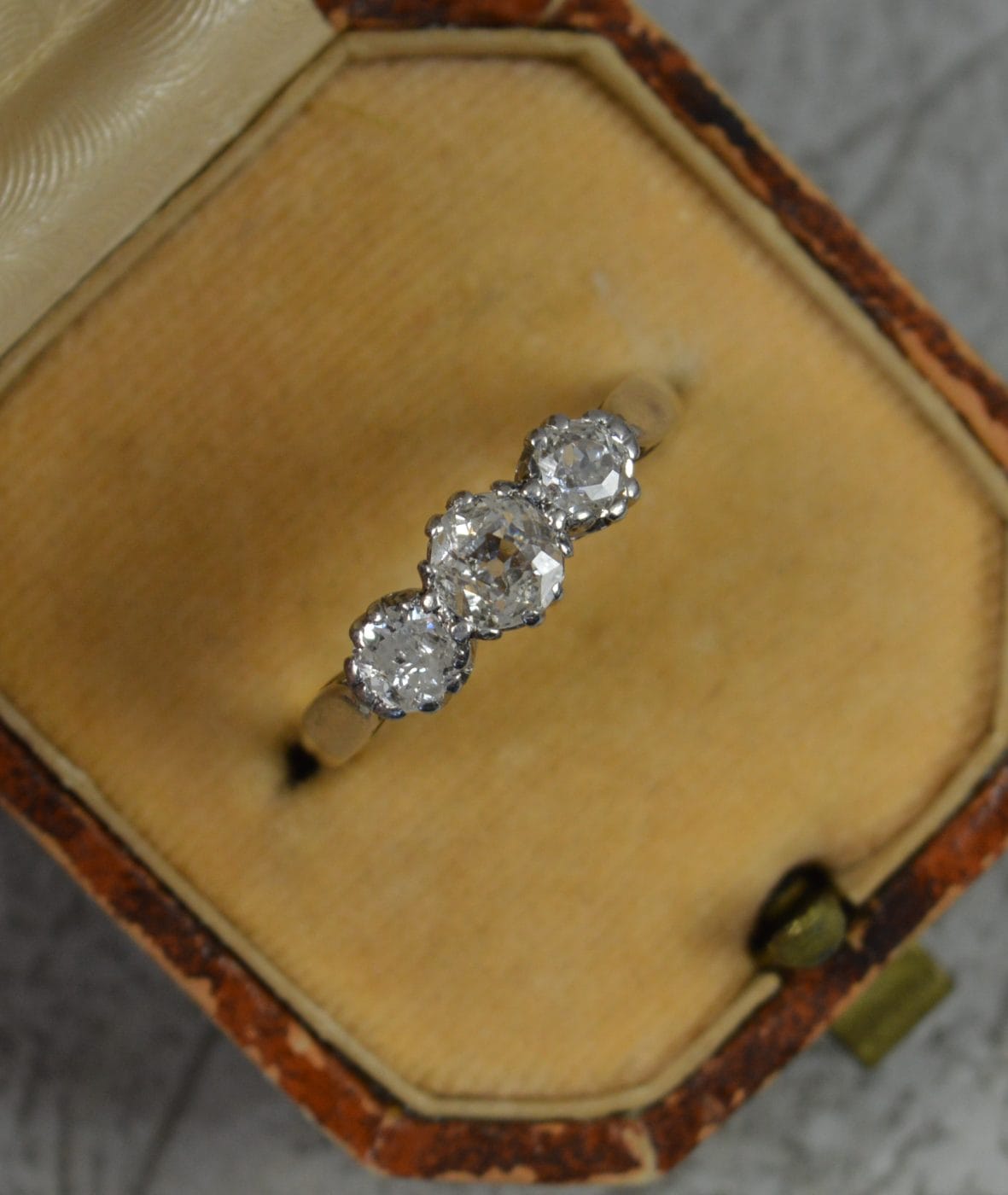 Designed with three old mine cut diamonds, the centre being 0.5 carat and the three total 0.9 carats.