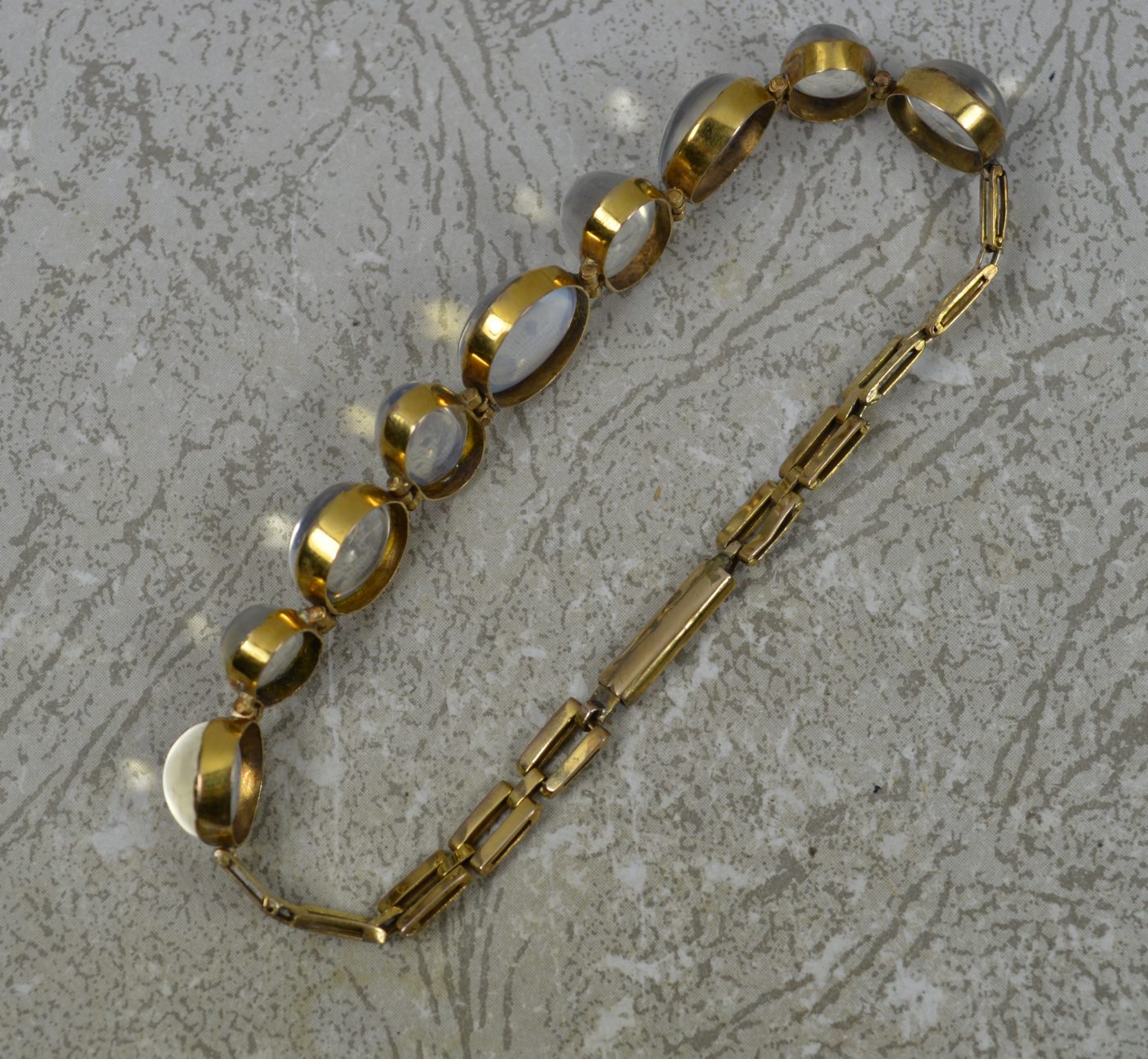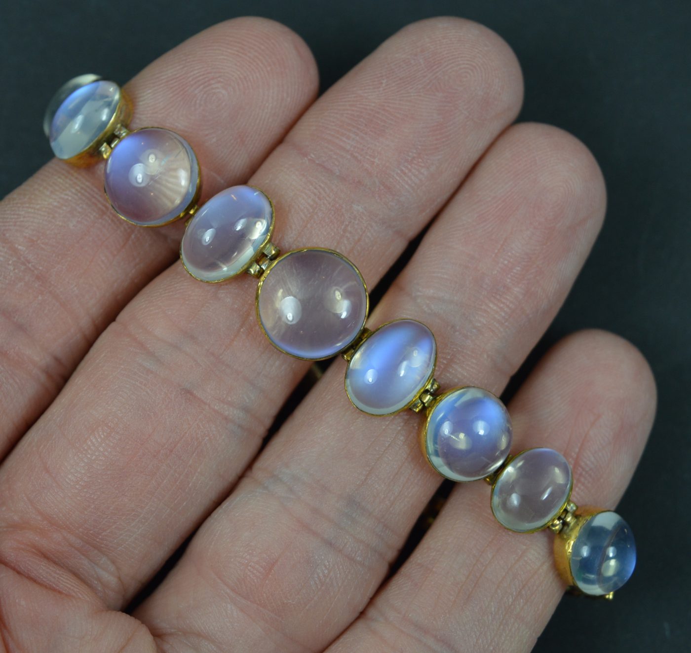 Set with nine natural round and oval shaped moonstones in bezel settings. Full of colour to each.