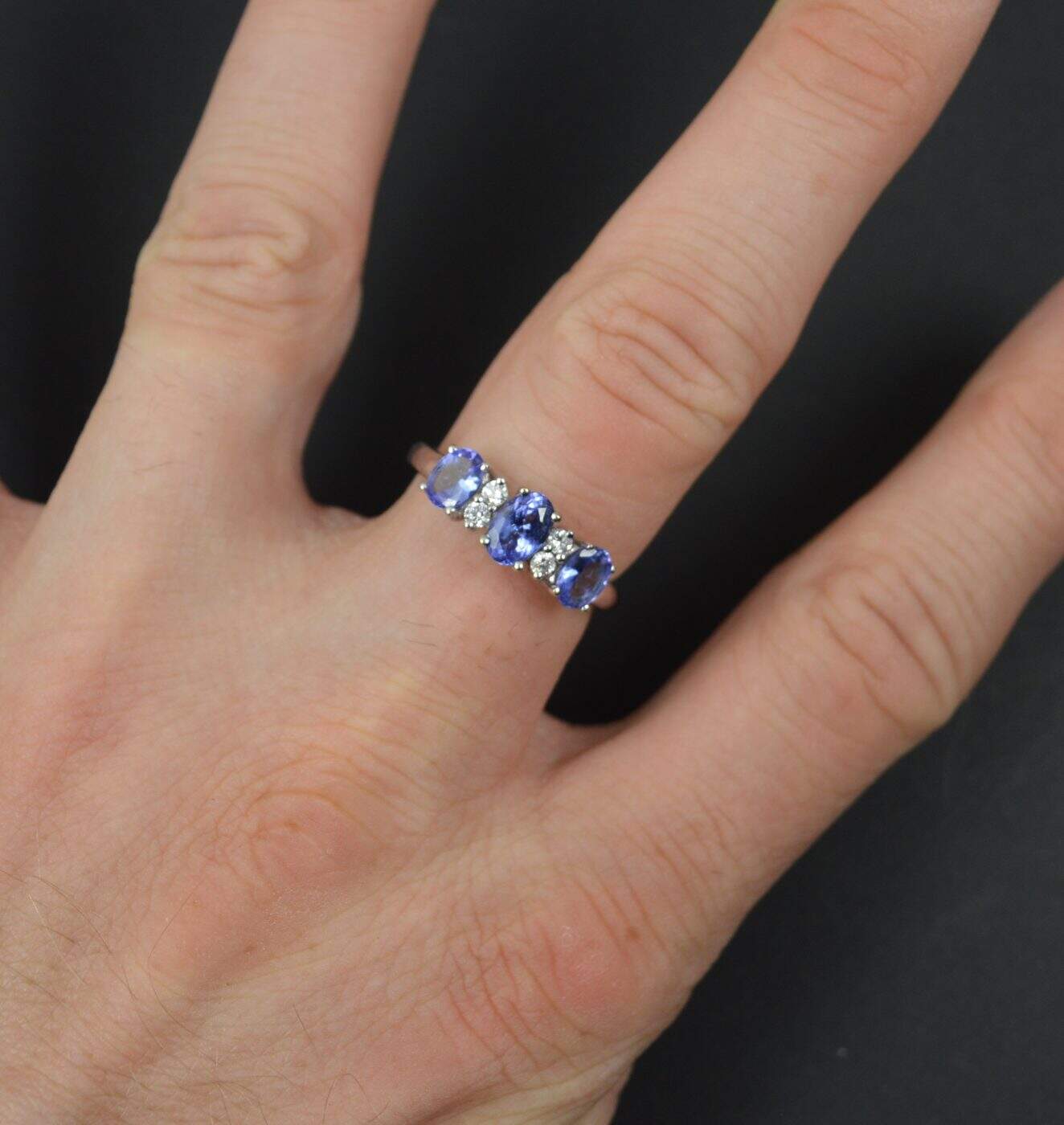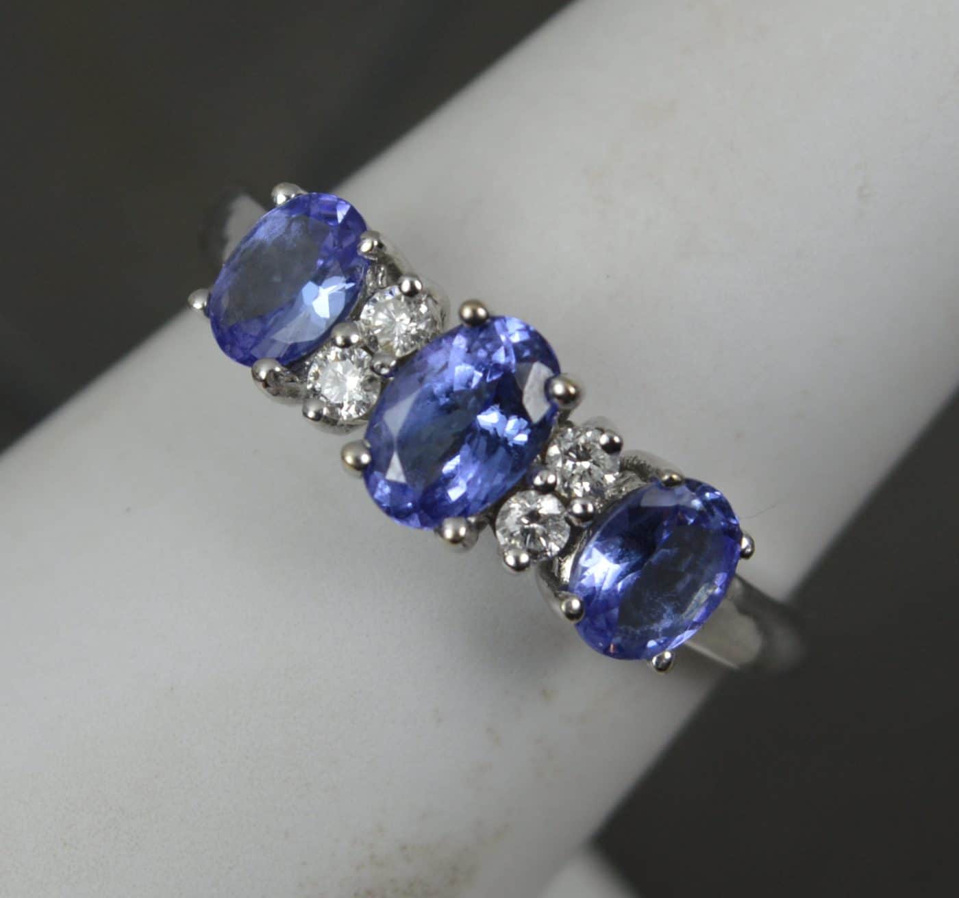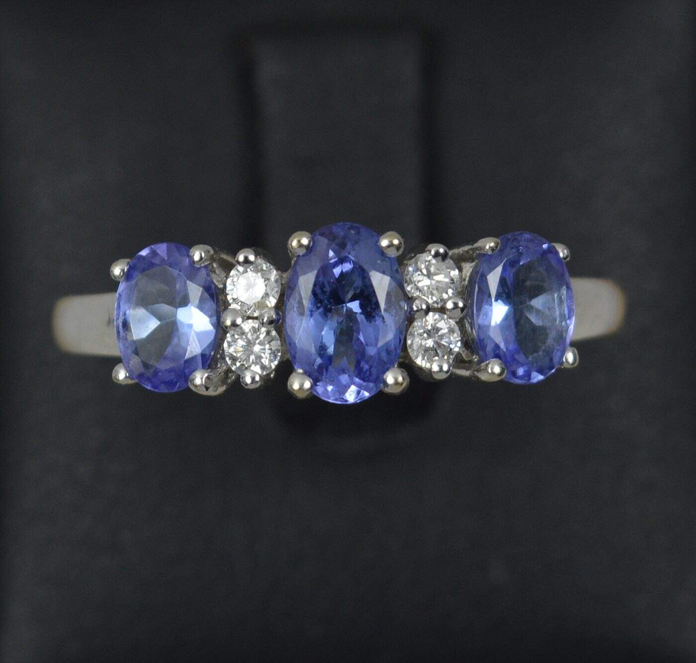 Designed with three oval cut tanzanites and pairs of round cut diamonds in between. A classic and well proportioned cluster.