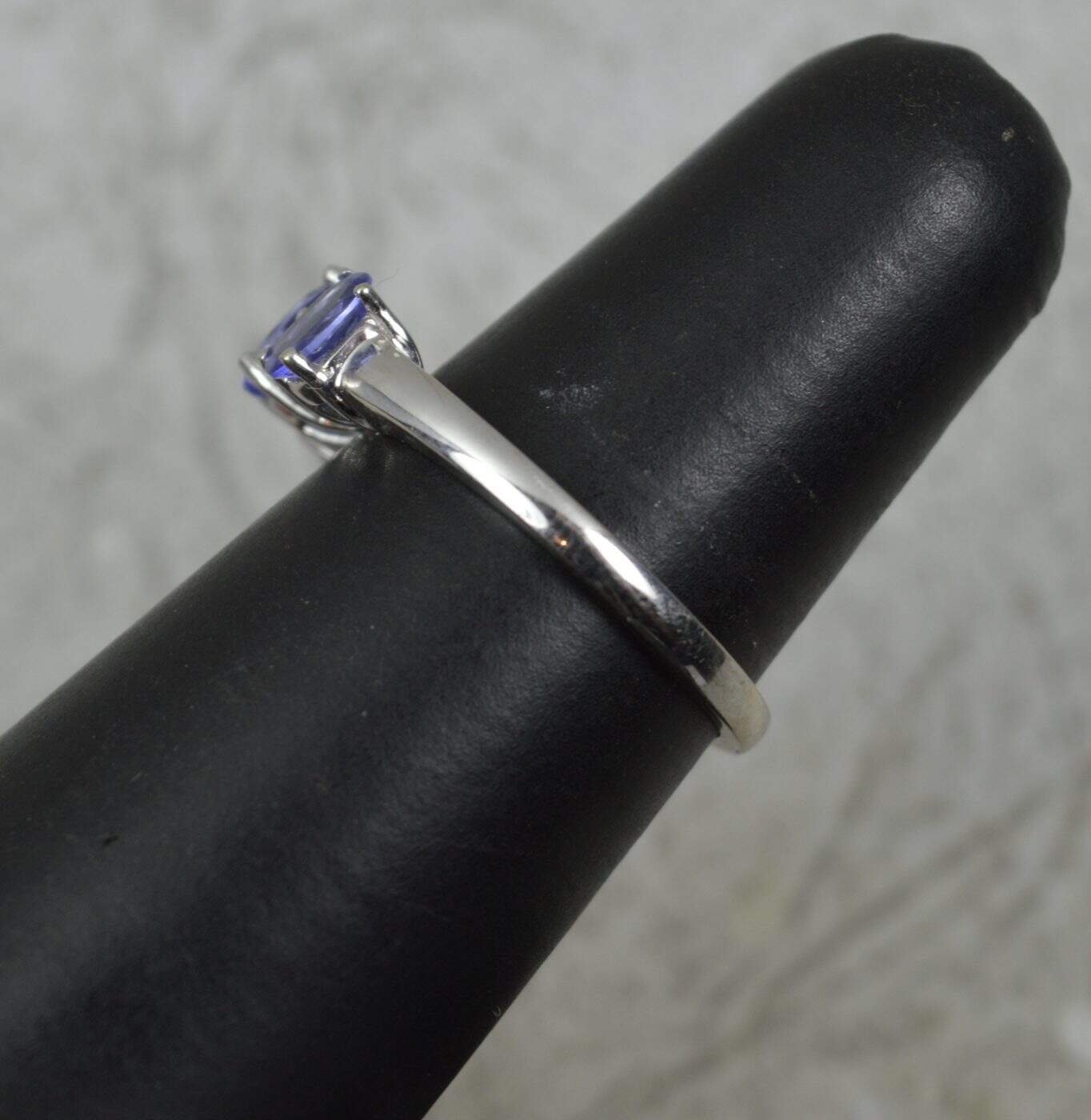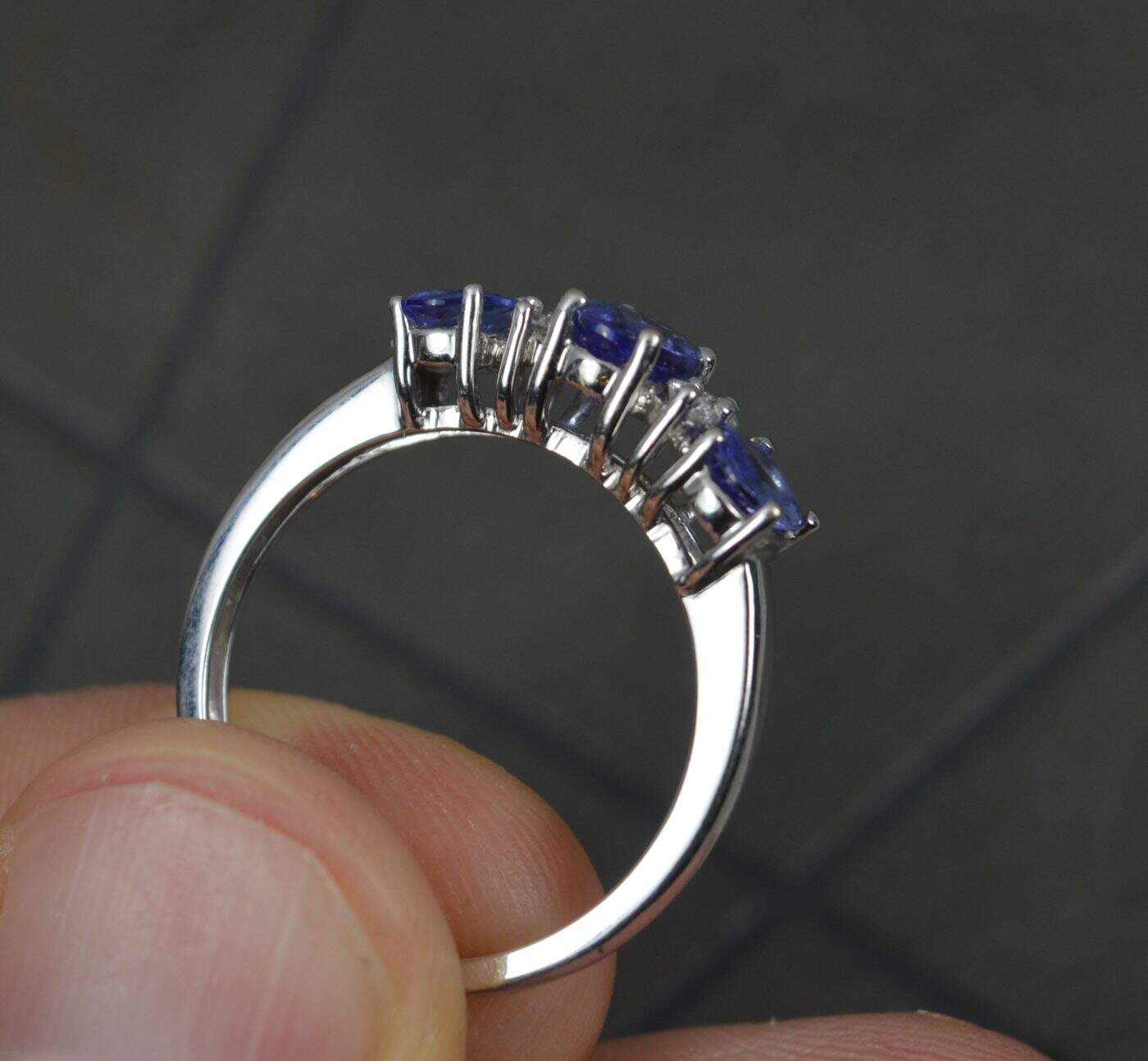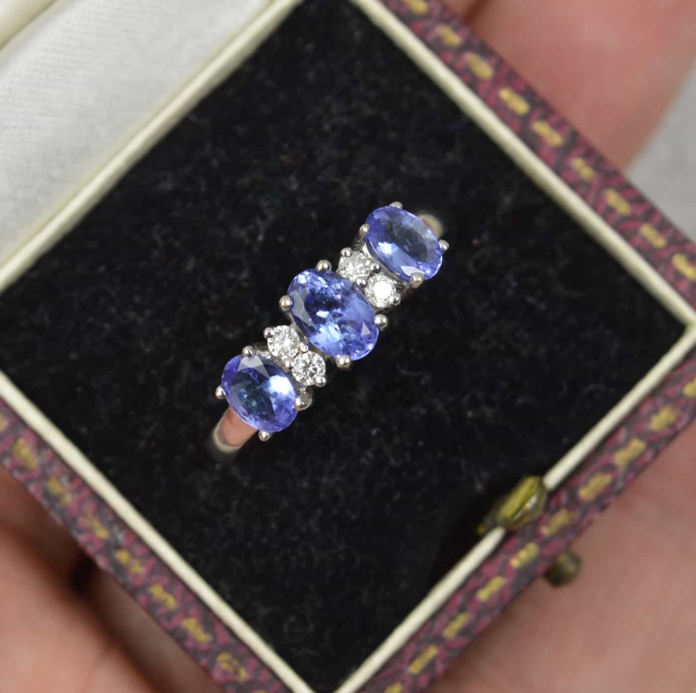 Designed with three oval cut tanzanites and pairs of round cut diamonds in between. A classic and well proportioned cluster.