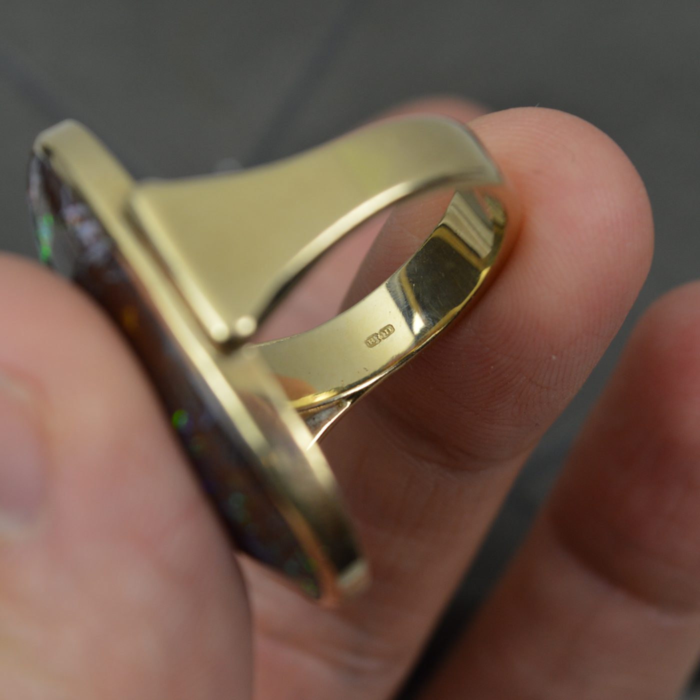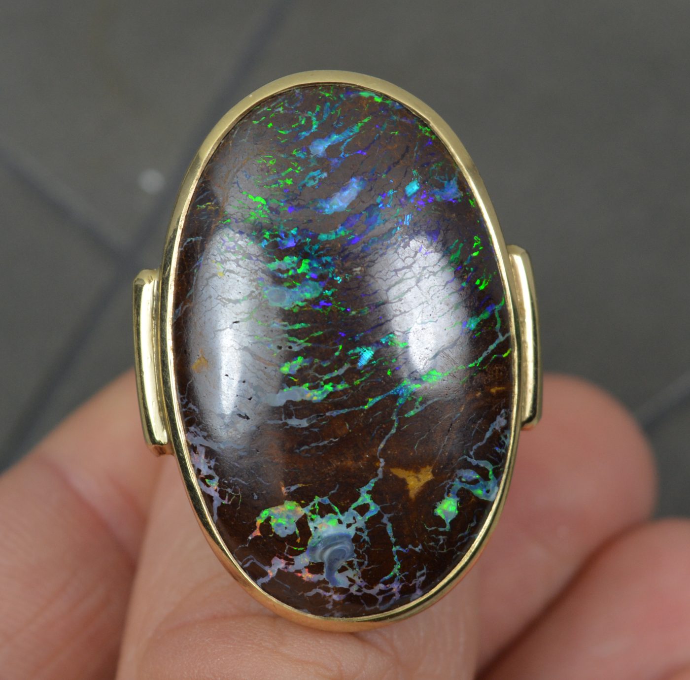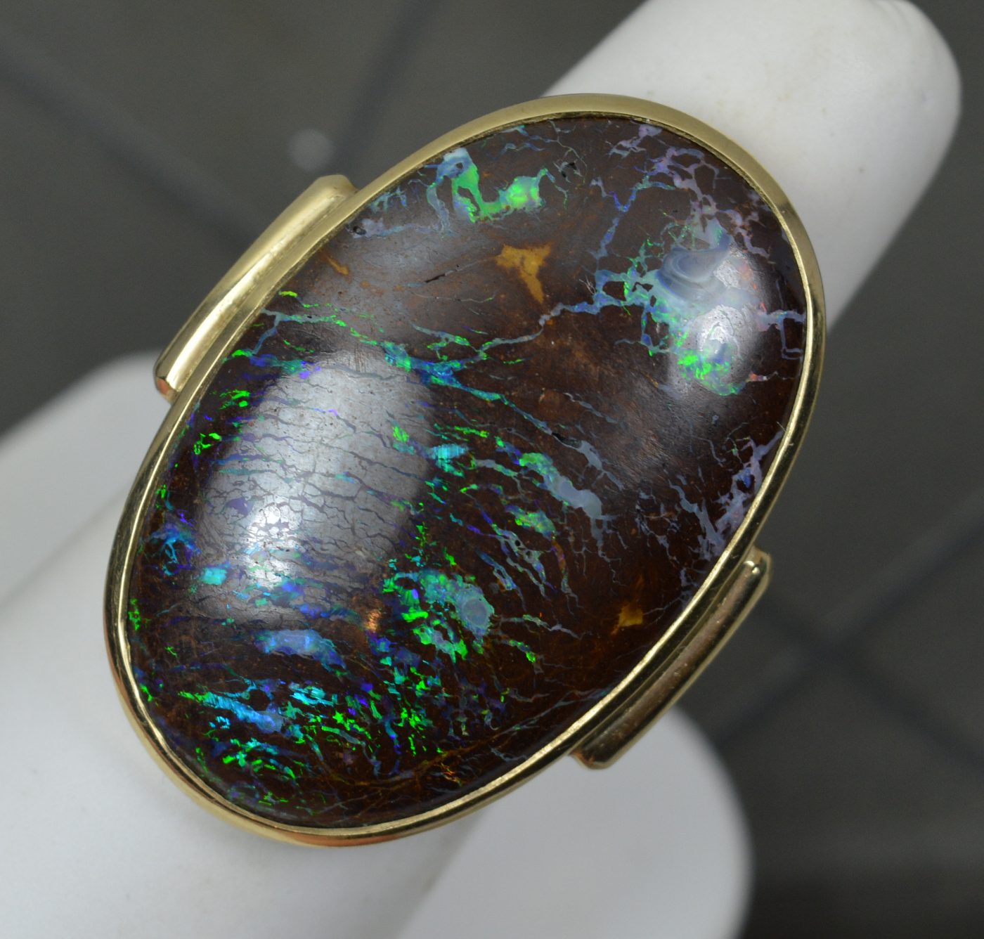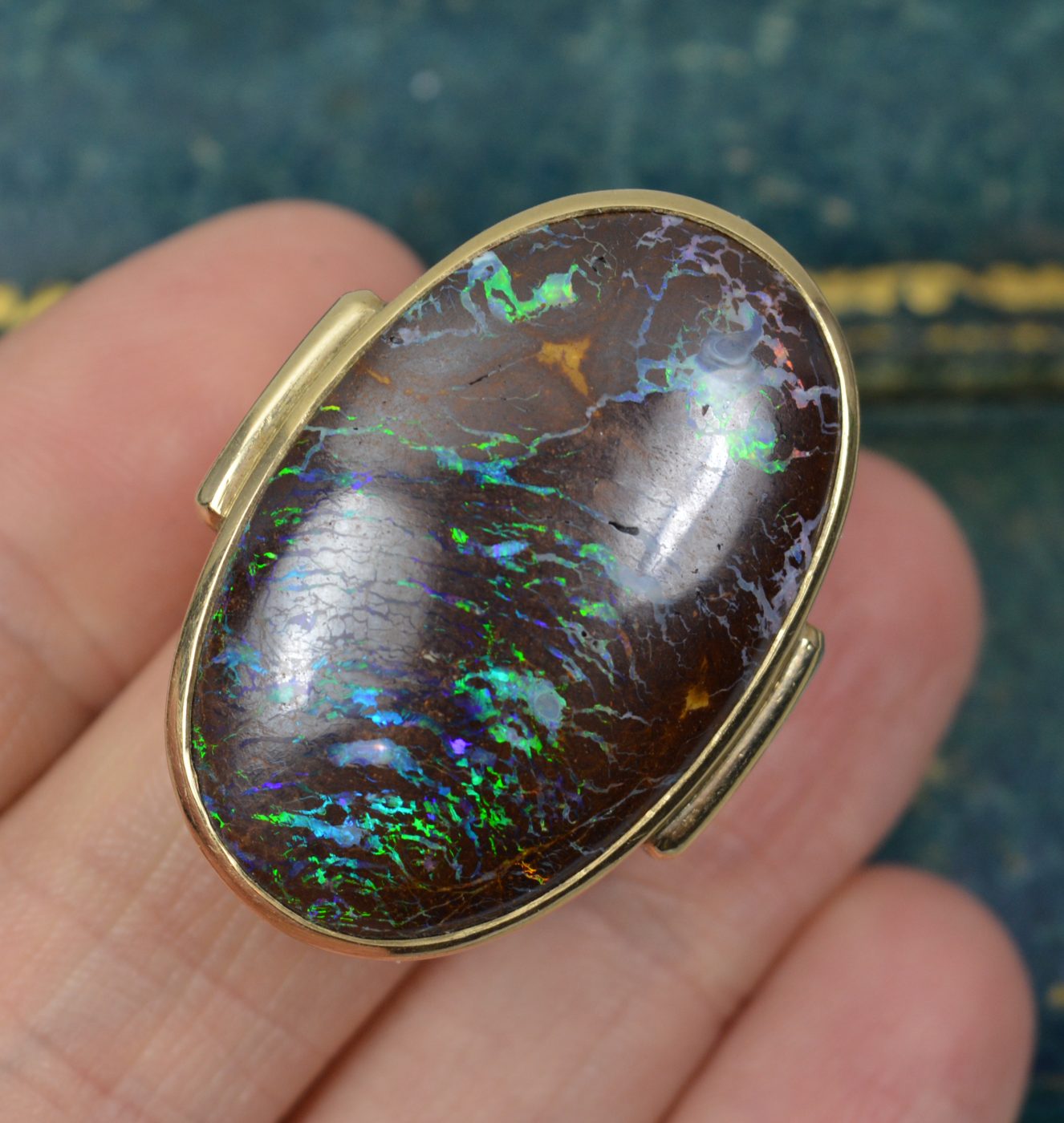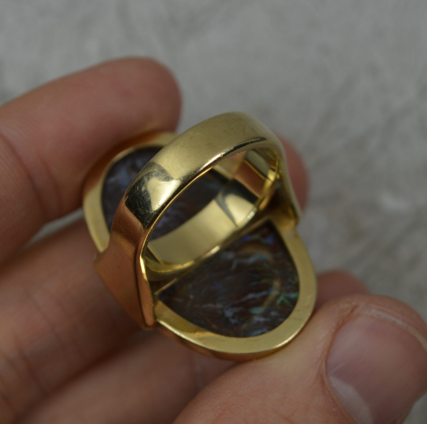 Set with a large, oval shaped boulder opal, 20mm x 32mm. Streaks of blues and greens run through the stone throughout.