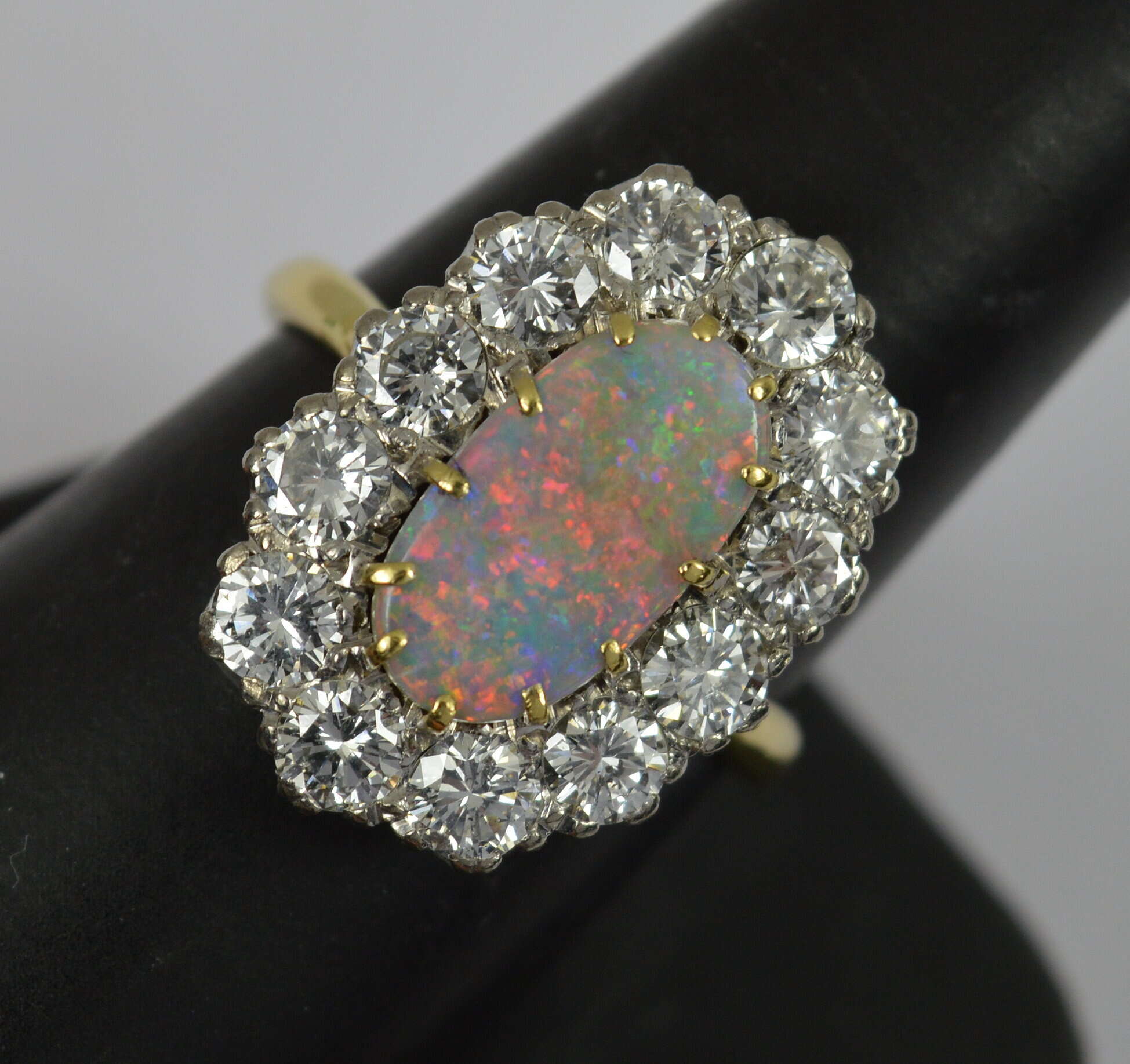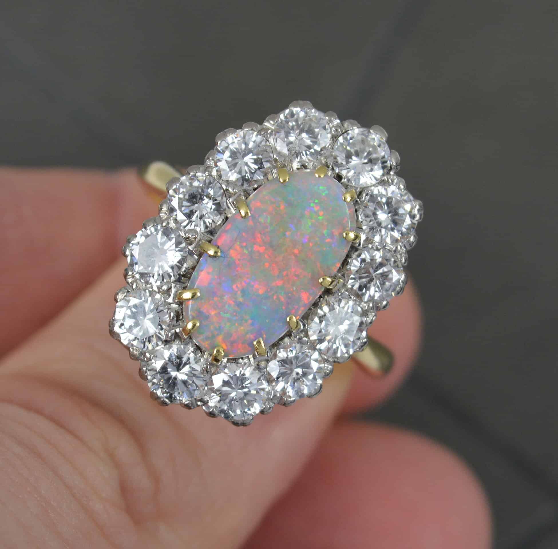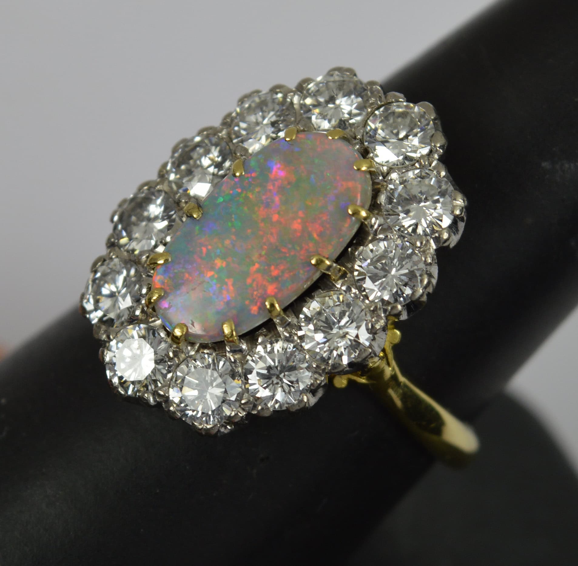 Classically designed with an oval opal to the centre, 7.8mm x 14mm. Full of colour. Surrounding are 12 round brilliant cut natural diamonds, 2.75 carats. Vs-Si clarity, g-h colour. All natural stones.