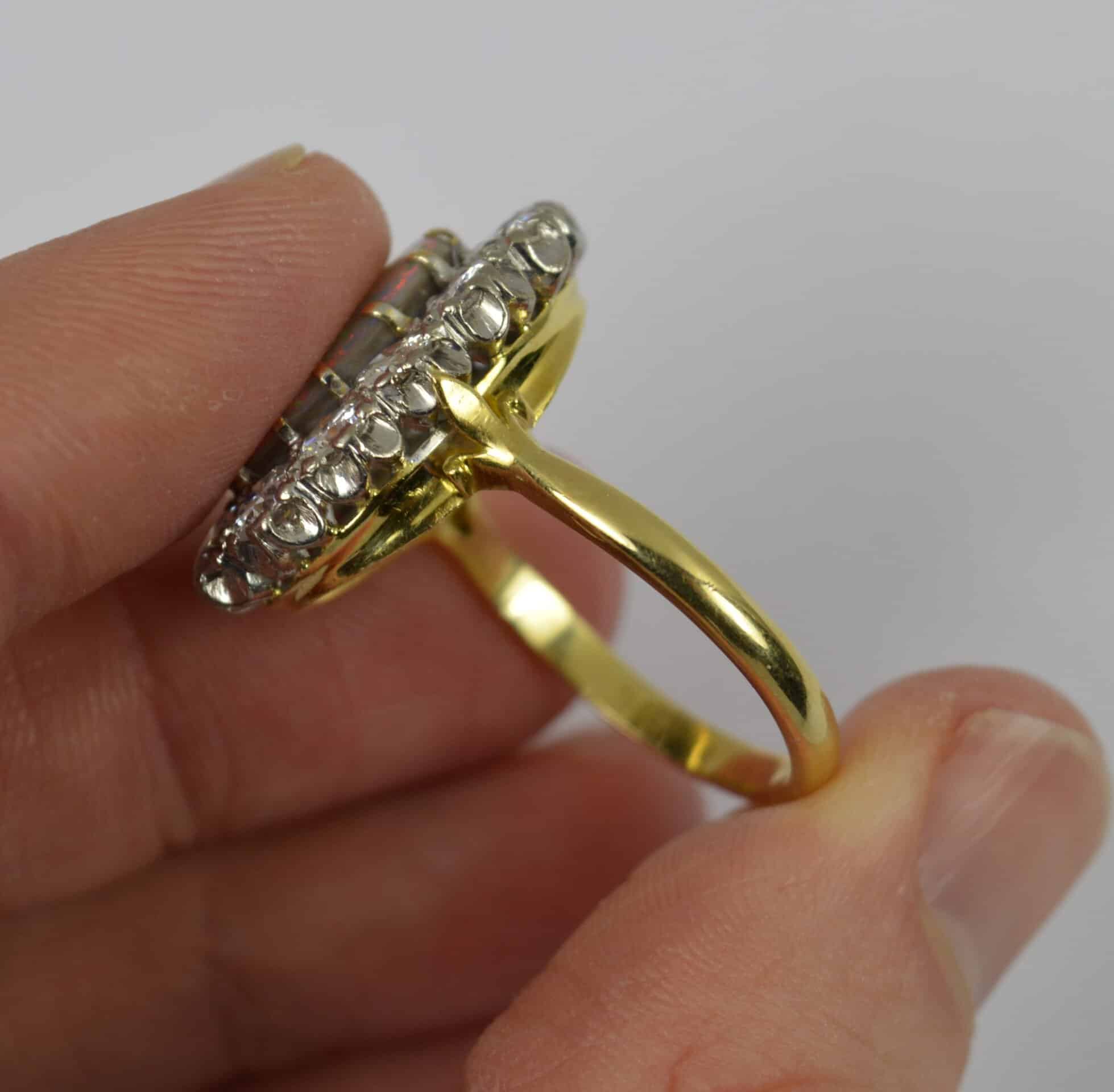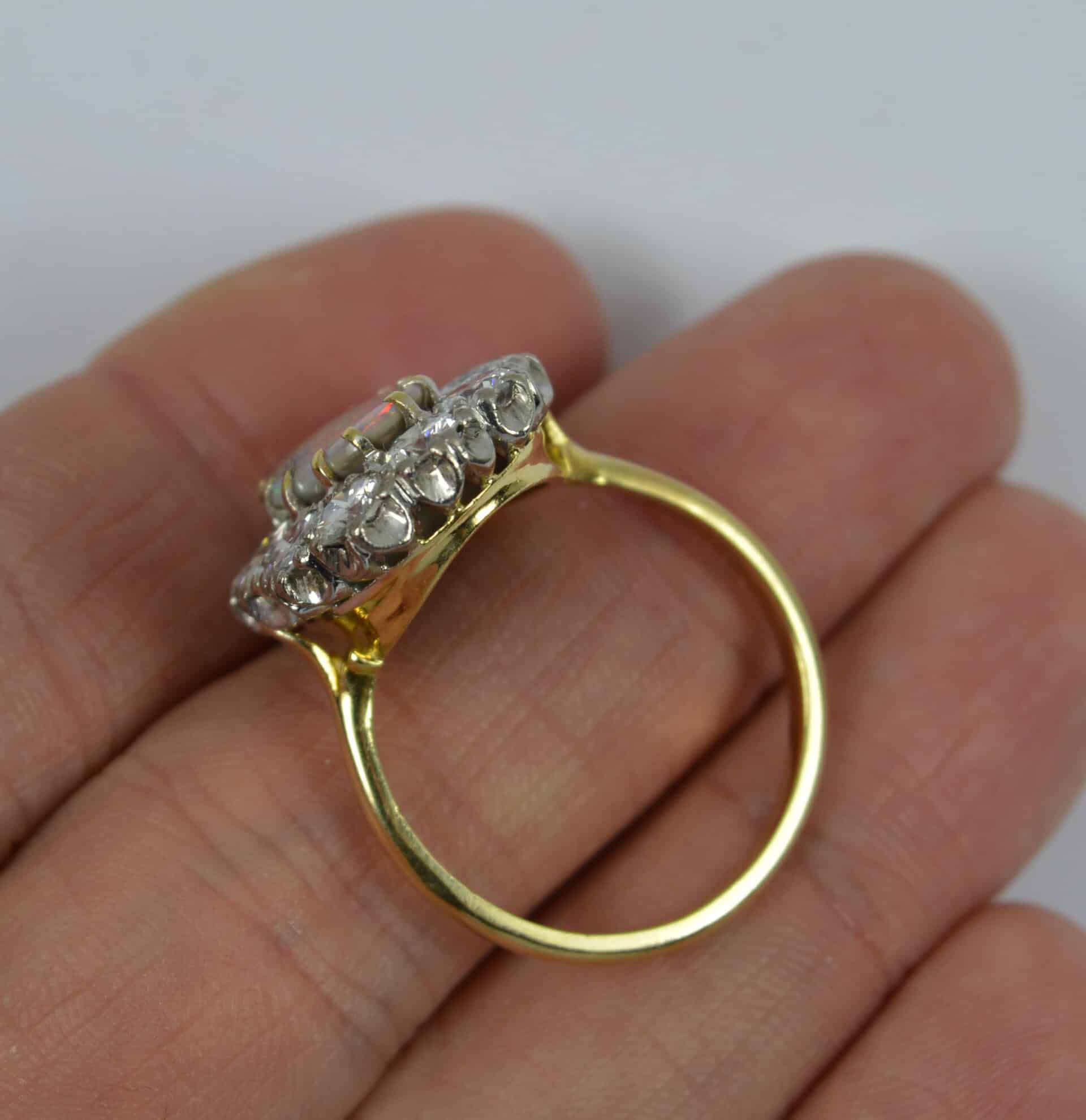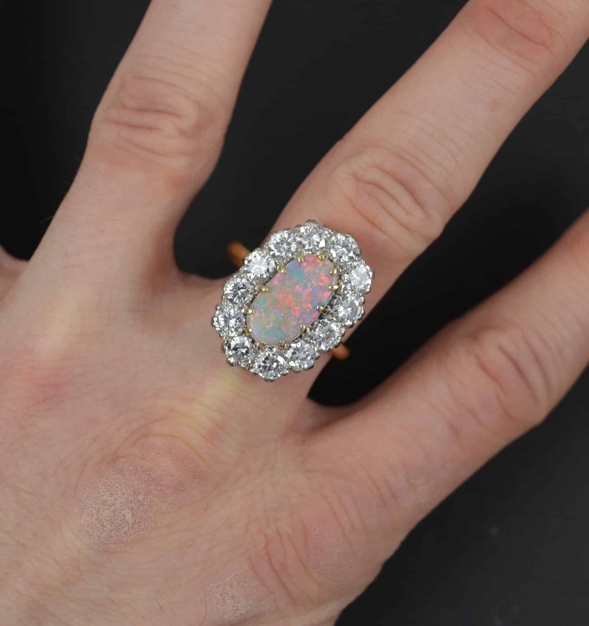 Classically designed with an oval opal to the centre, 7.8mm x 14mm. Full of colour. Surrounding are 12 round brilliant cut natural diamonds, 2.75 carats. Vs-Si clarity, g-h colour. All natural stones.