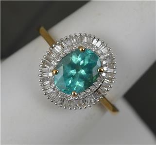 Set with an oval cut apatite to centre in four claw setting. 7mm x 9mm. Surrounding is a border of brilliant cut diamonds with final border of baguette cut diamonds to the edge. 13mm x 14.5mm cluster head.