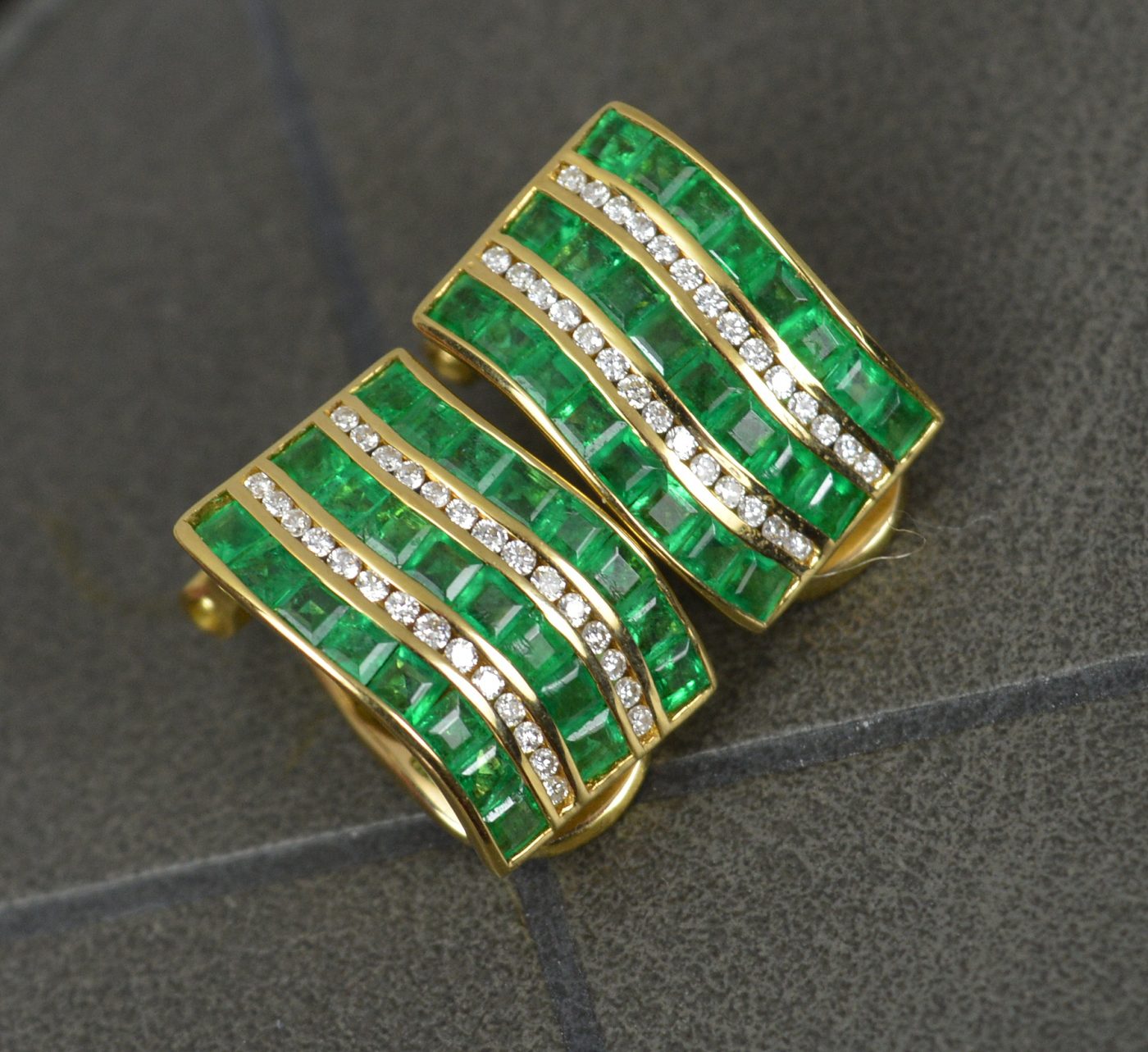 Designed as a waved shape with three columns of princess cut deep green emeralds and two columns of brilliant cut diamonds. All natural, Earth mined stones. Vibrant and sparkly. 56 Vs clarity, f-g colour.