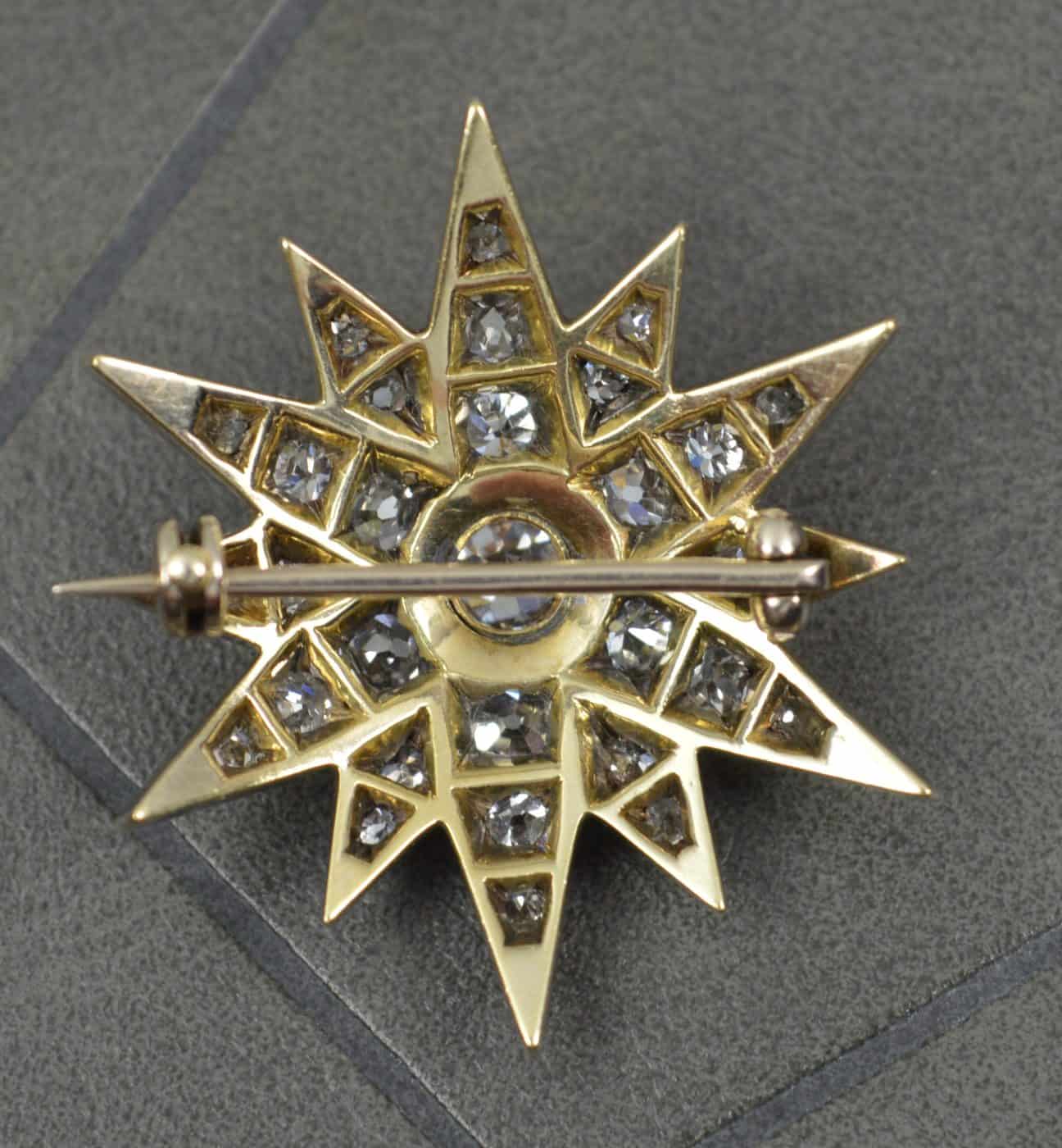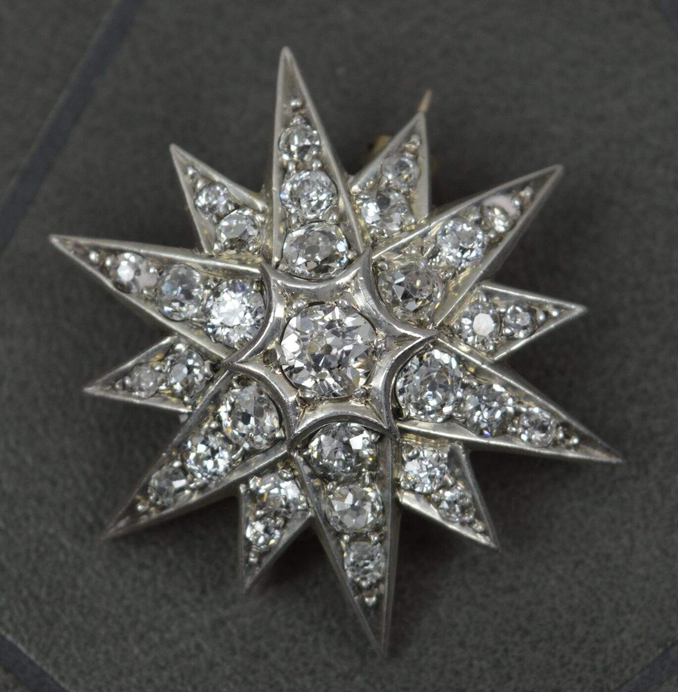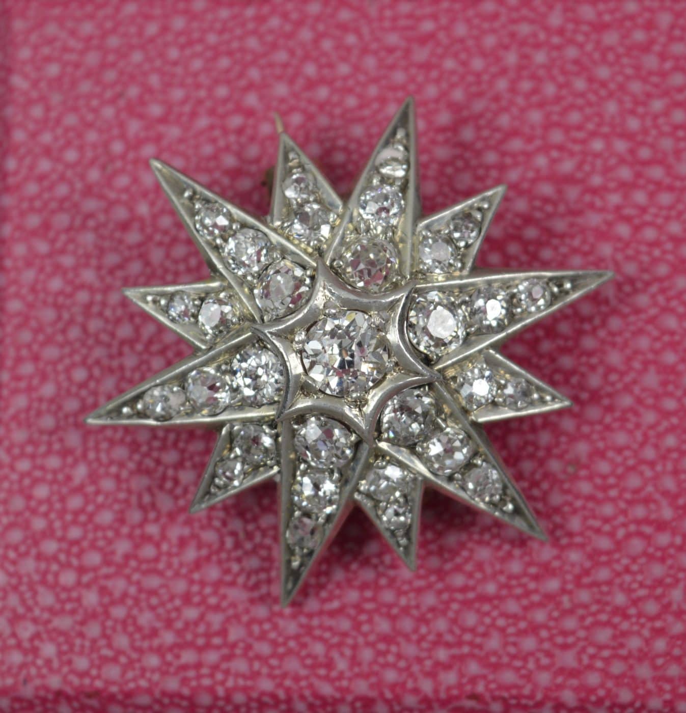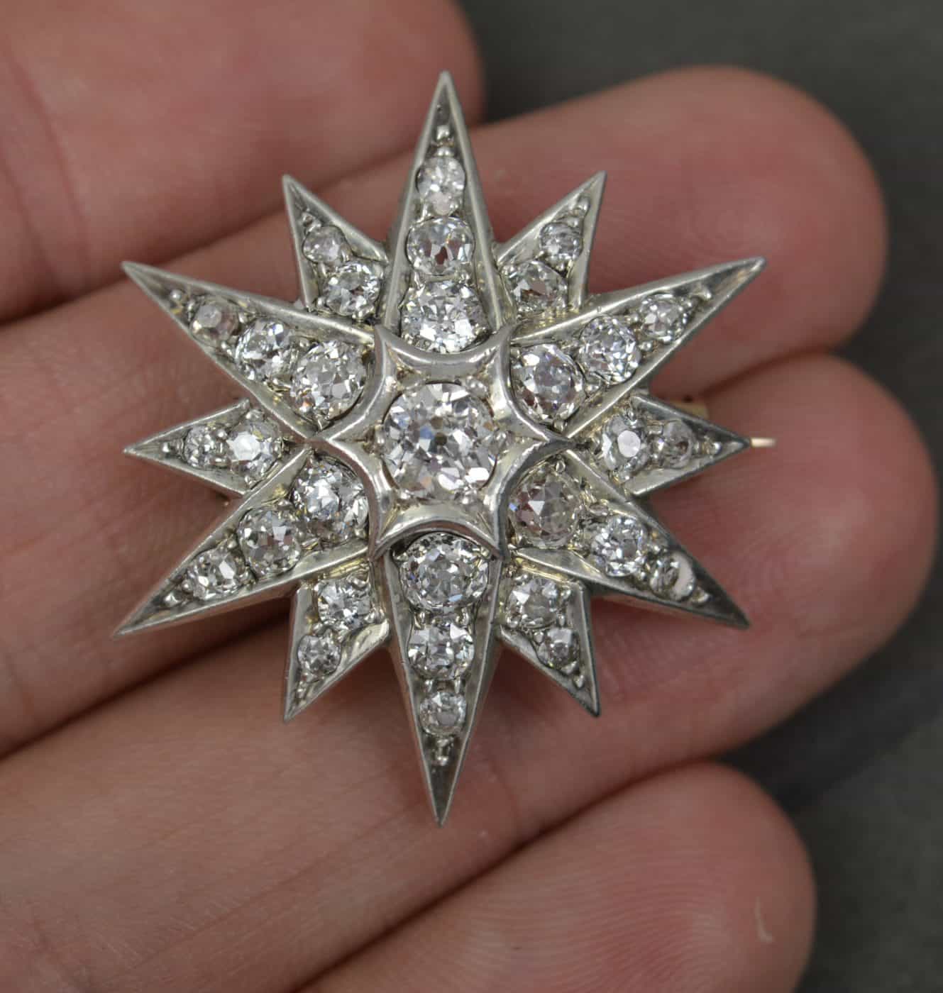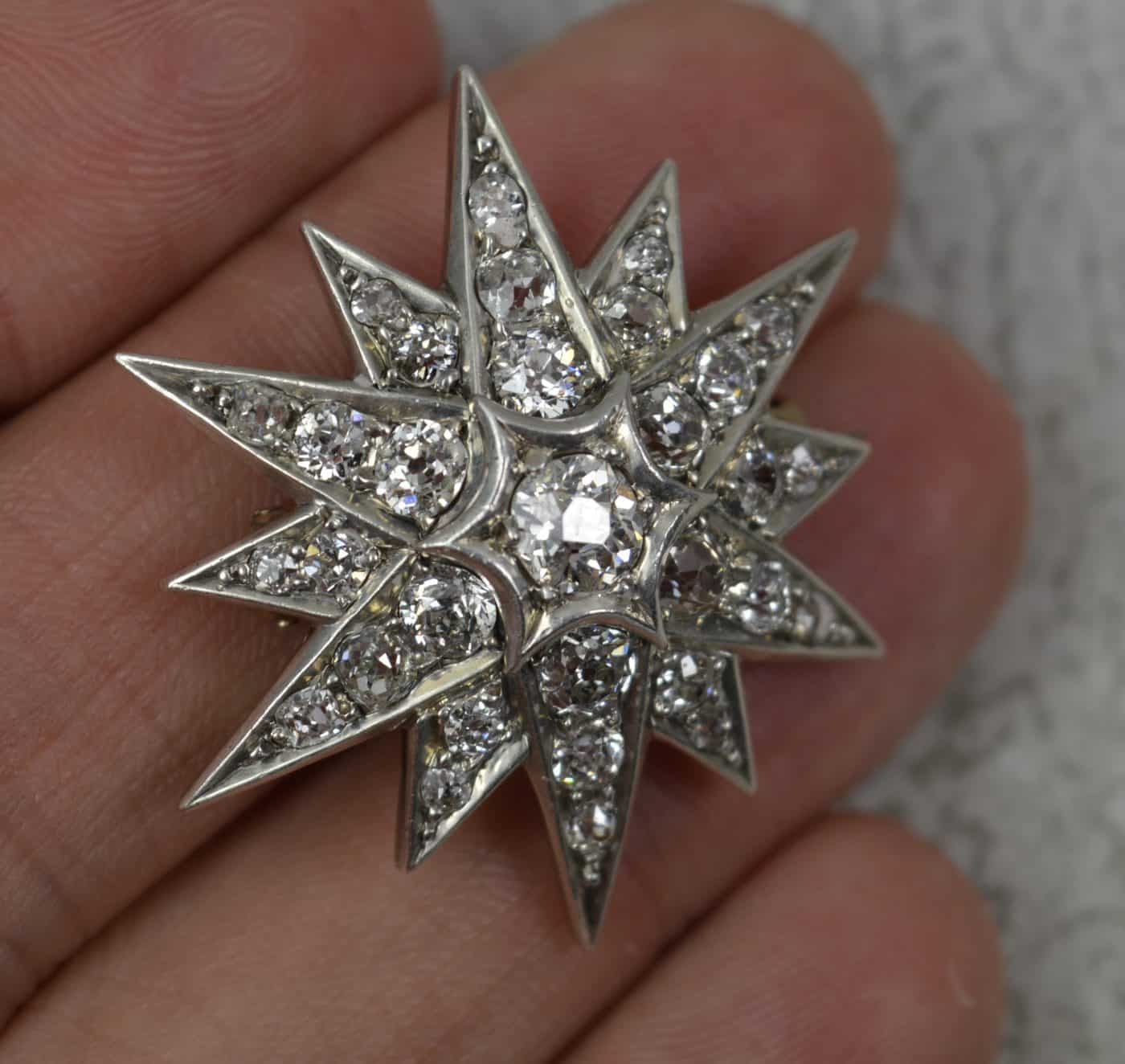 Twelve pointed star, set with 31 natural, Earth mined, old mine cut diamonds to total 2.5 – 2.7 carats.