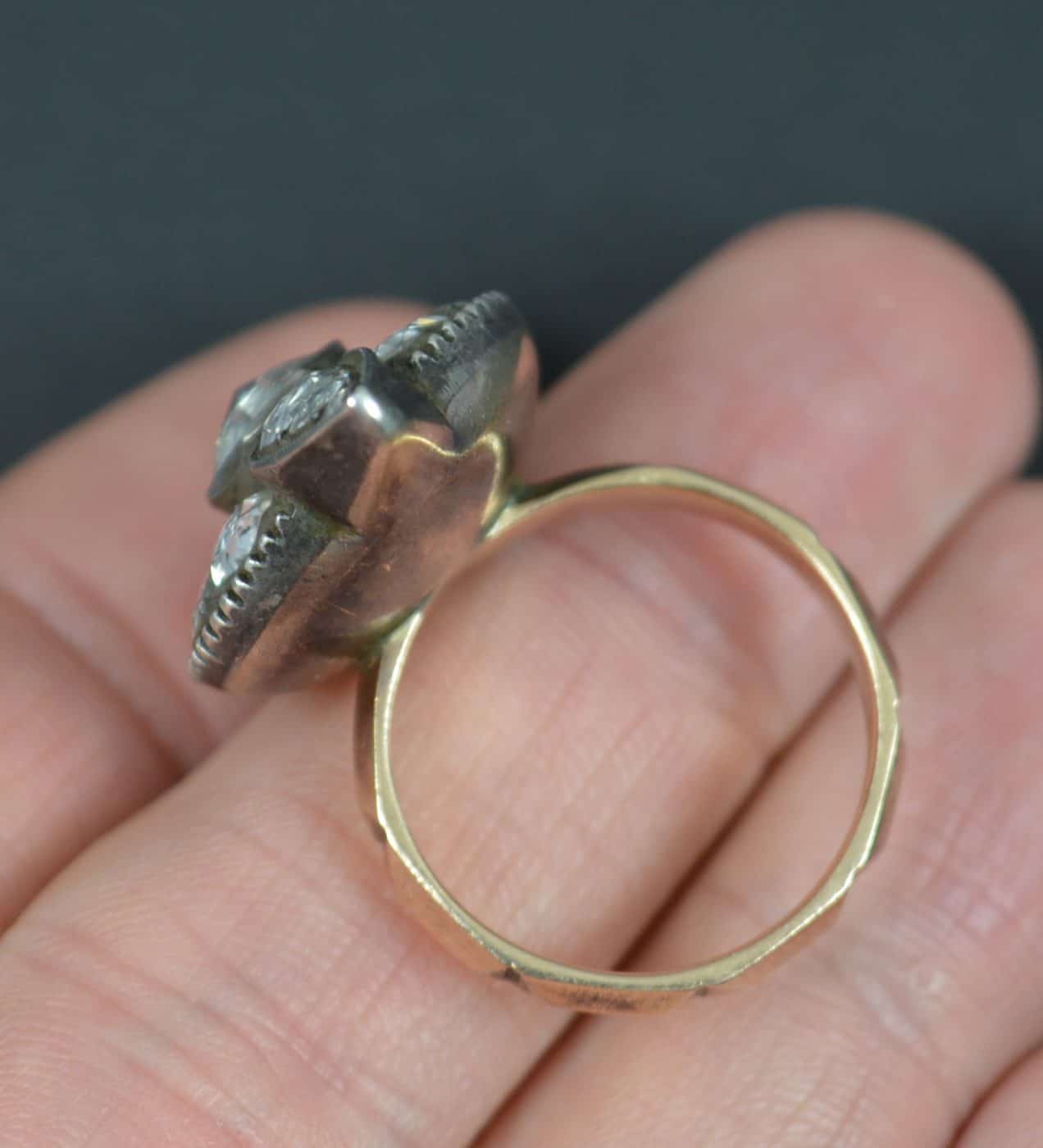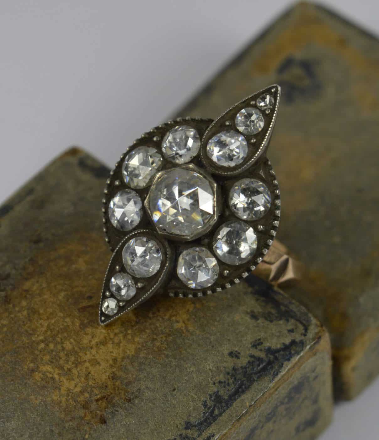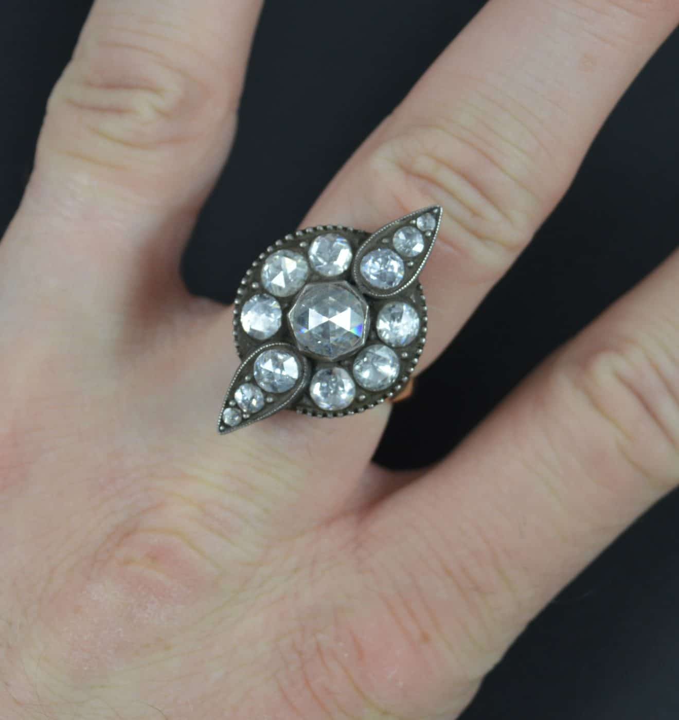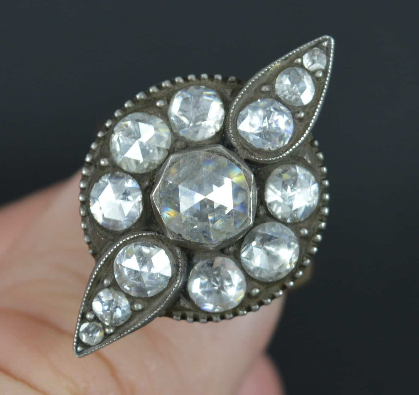 Designed with thirteen natural, untreated diamonds. All rose cut, very clean and sparkly and in foiled back settings. The centre diamond to spread over 1 carat and to total over 3.75 carats in spread. A striking piece.
